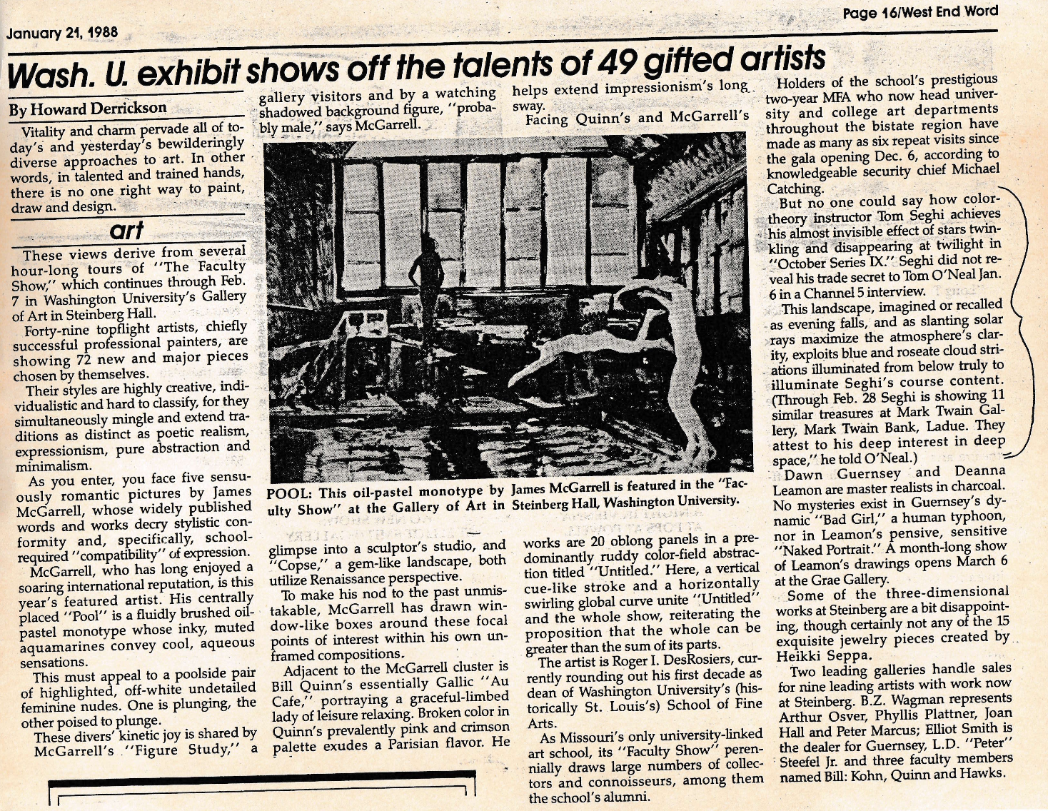 St. Louis Post-Dispatch. “Wash. U. exhibit shows off the talents of 49 artists.” By Howard Derrickson. St. Louis Post-Dispatch, 21. Jan. 1988, St. Louis, MO.