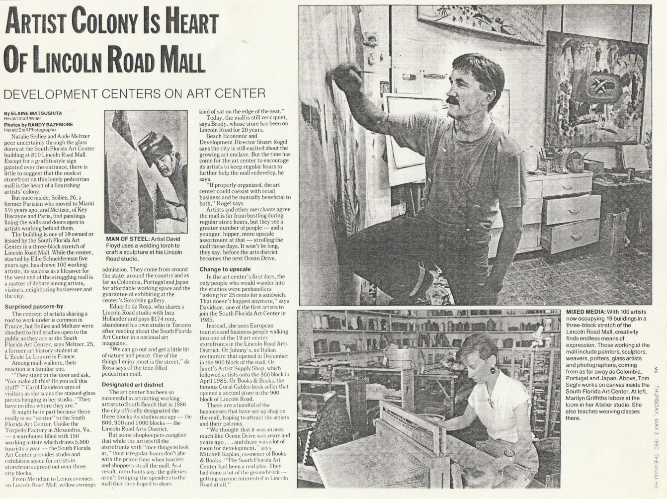 Miami Herald. “Artist Colony is Heart of Lincoln Road Mall.” By Elaine Matsushita. Photos by Randy Bazemore. Miami Herald, 3 May 1990, Miami, FL.