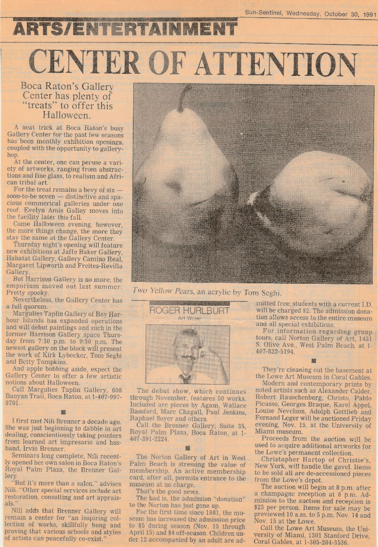 Sun-Sentinel. “Center of Attention.” By Roger Hulbert. Sun-Sentinel, 30 Oct. 1991, Boca Raton, FL.