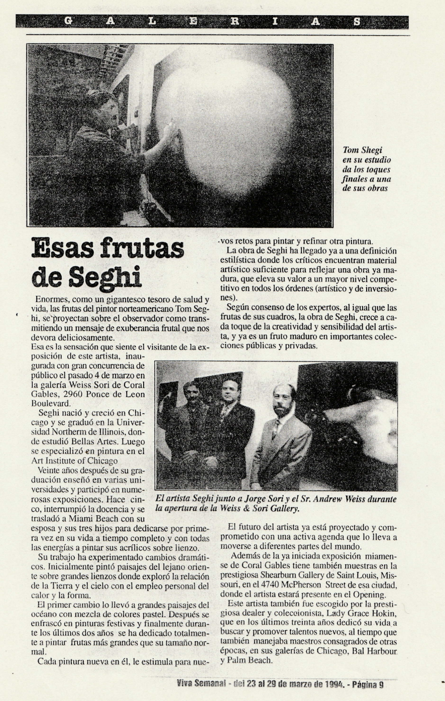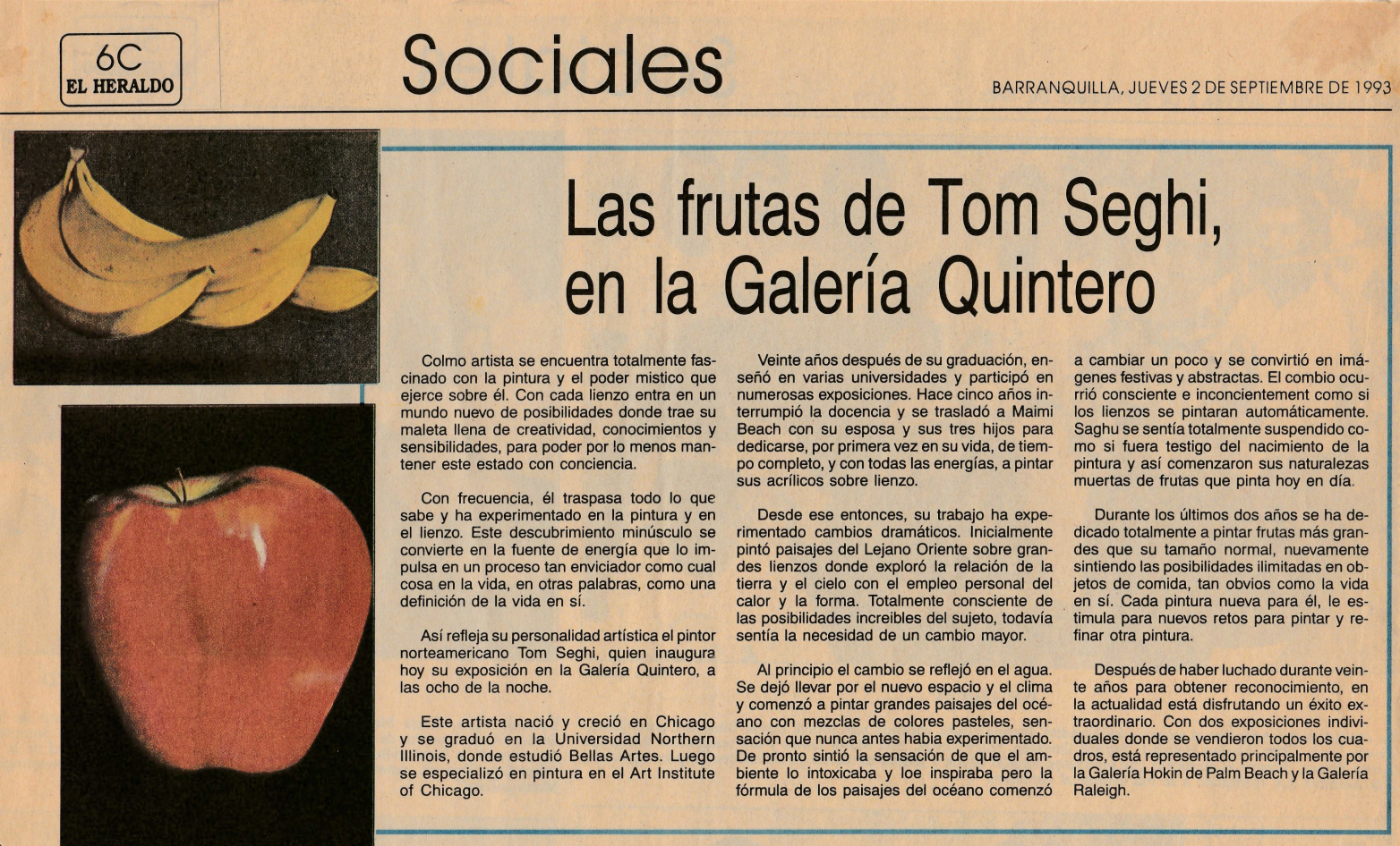 El Heraldo. “Las frutas de Tom Seghi, en la Galería Quintero.” El Heraldo, 2 Sept. 1993, Barranquilla, Colombia.