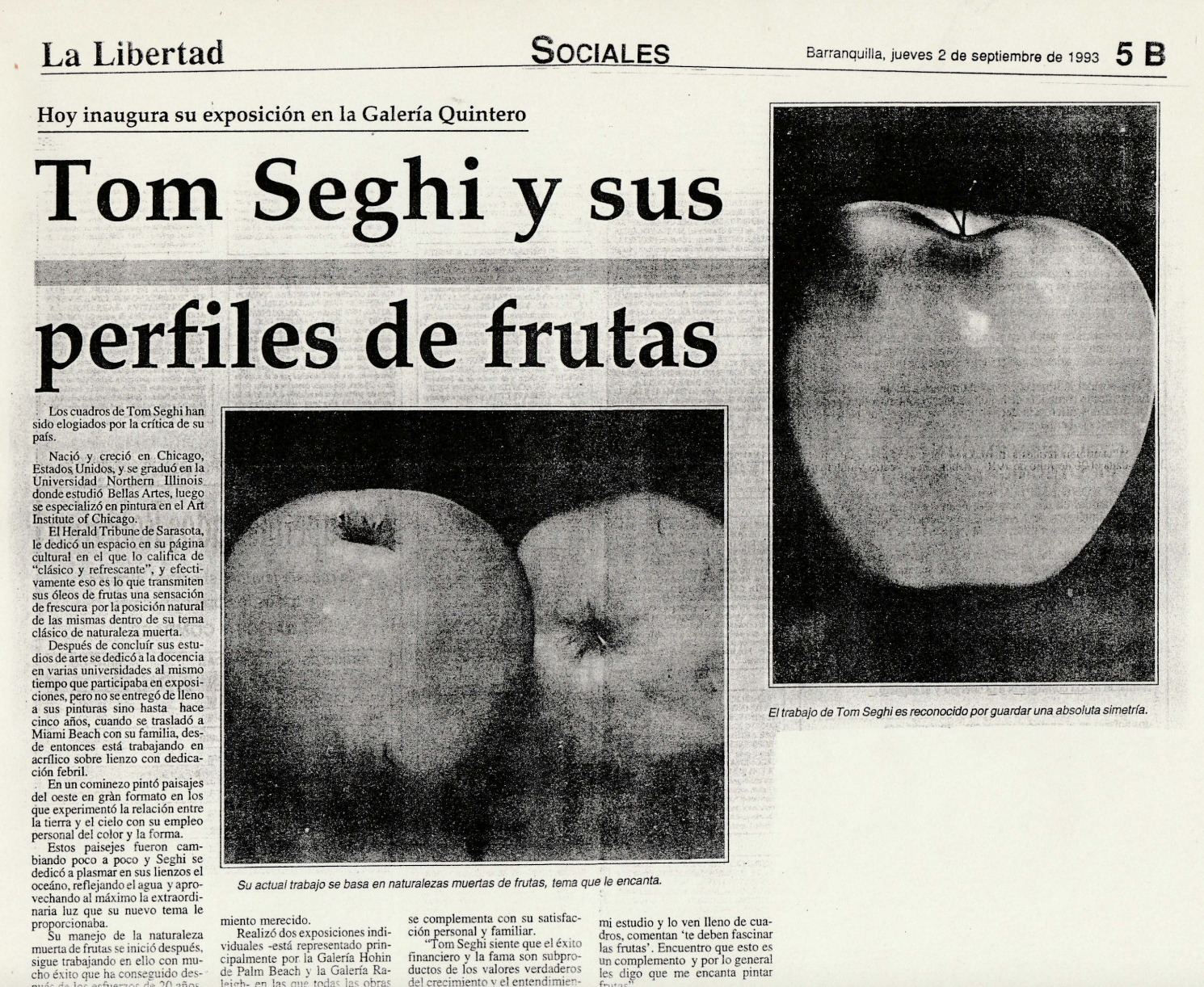 Diario La Libertad. “Tom Seghi y sus perfiles de frutas.” La Libertad, 2 Sept. 1993, Barranquilla, Colombia.