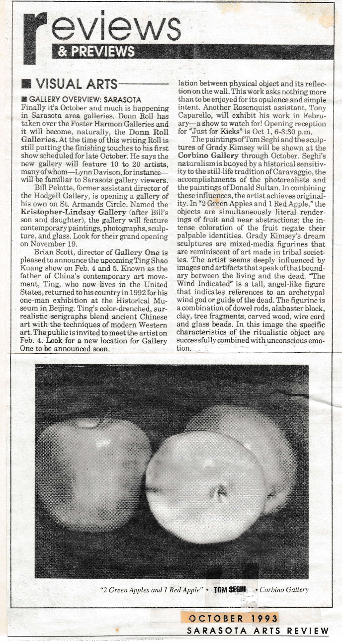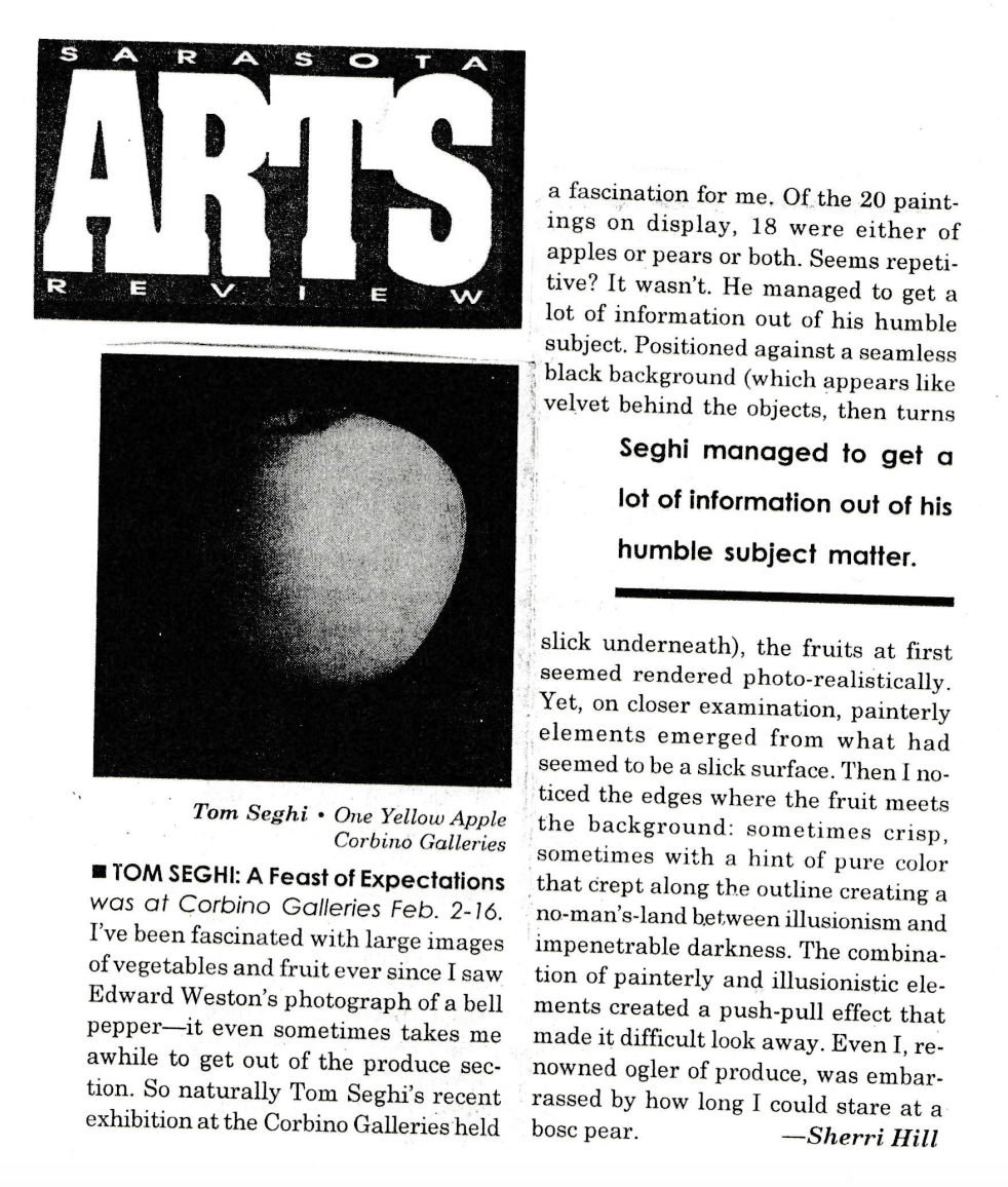 Sarasota Arts Review. “Tom Seghi: A Feast of Expectations.” By Sherri Hill. Sarasota Arts Review, 2 Feb. 1996, Sarasota, FL.