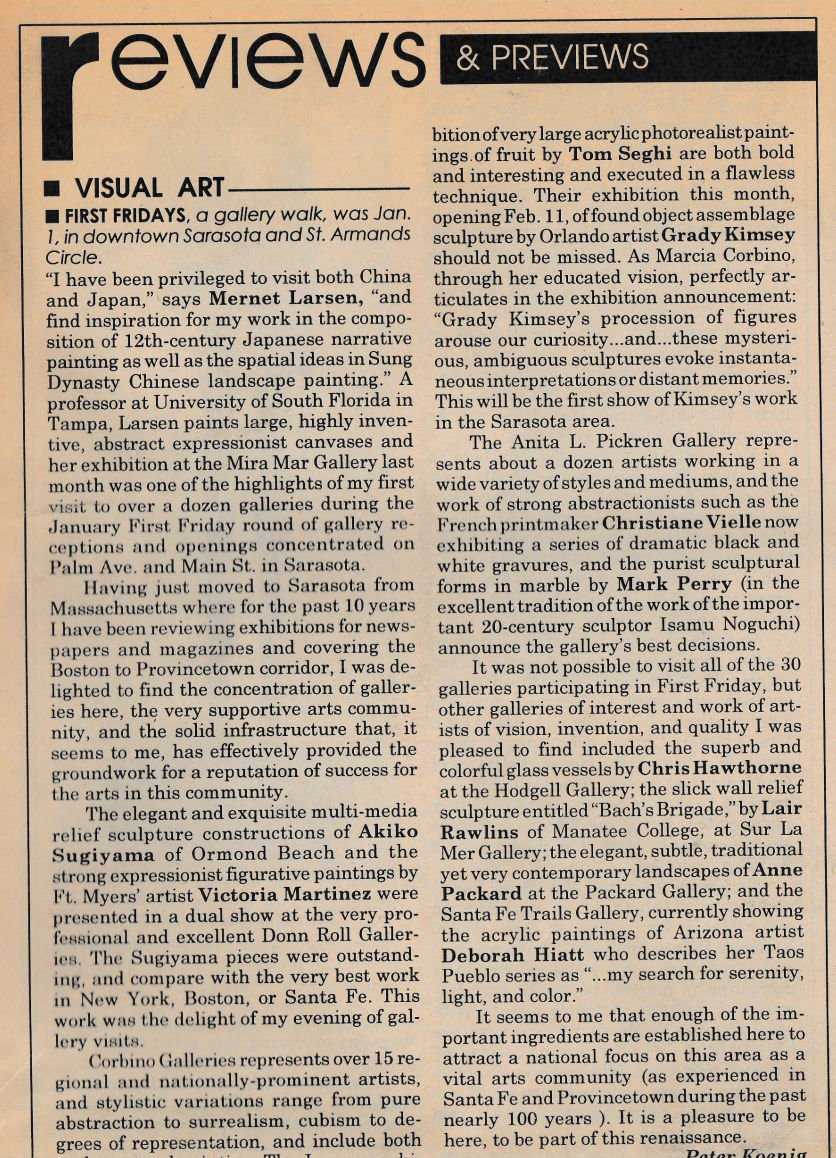 Sarasota Arts Review. “First Fridays.” By Peter Koenig. Sarasota Arts Review, Feb. 1994, Sarasota, FL.