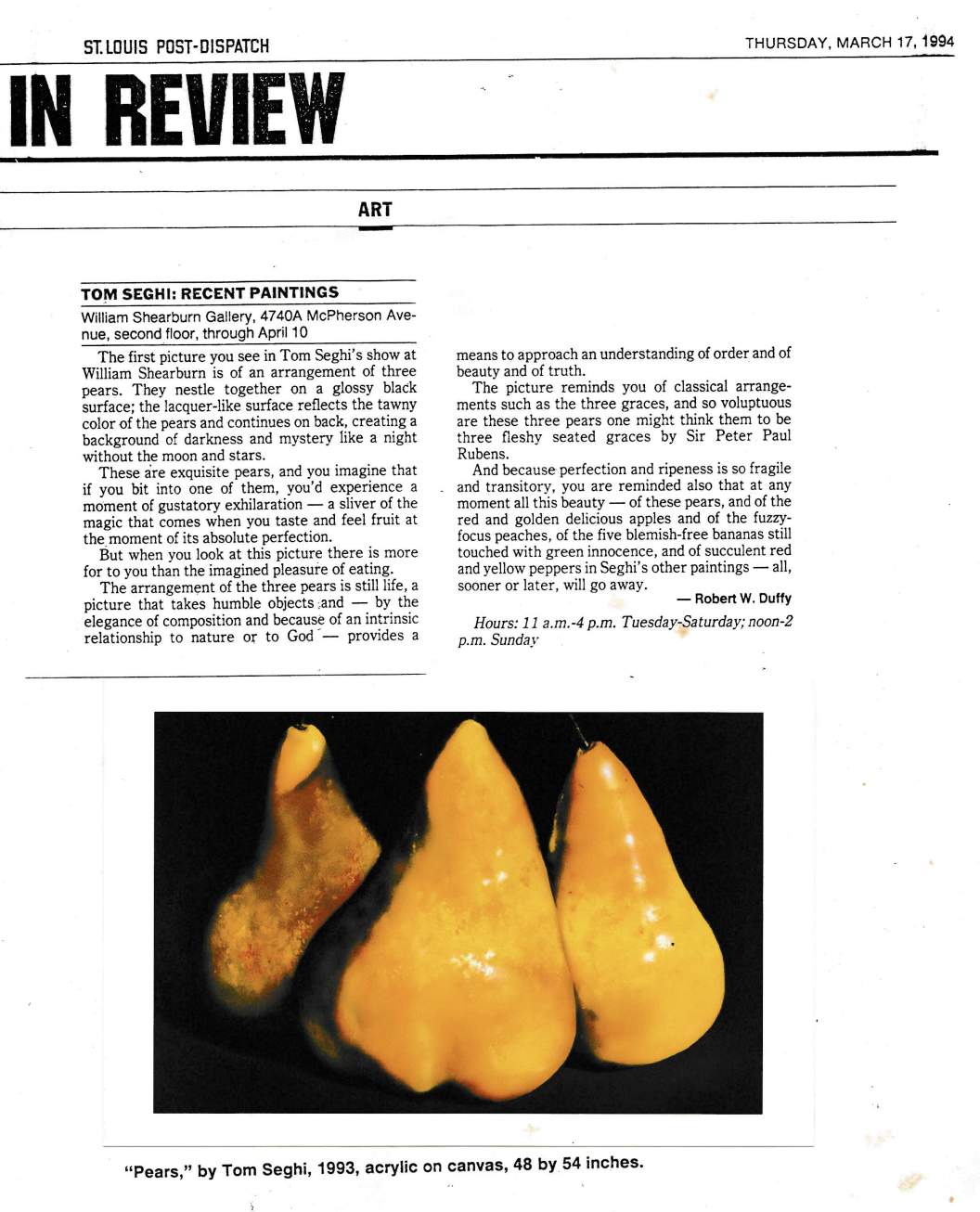 St. Louis Post-Dispatch. “In Review Tom Seghi: Recent Paintings.” By Robert W. Duffy. St. Louis Post-Dispatch, 17 Mar. 1994, St. Louis, MO.