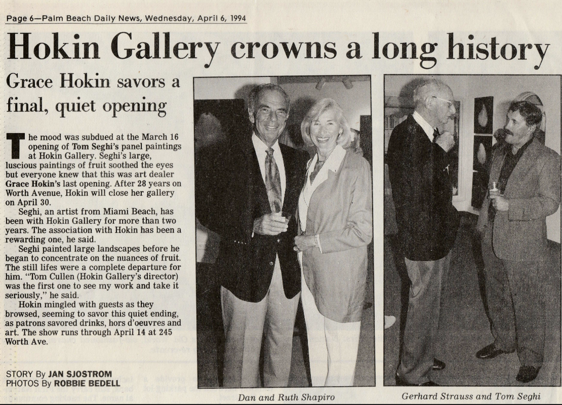 Palm Beach Daily News. “Hokin Gallery crowns a long history.” By Jan Sjostrom. Photos by Robbie Bedell. Palm Beach Daily News, 6 April 1994, Palm Beach, FL.