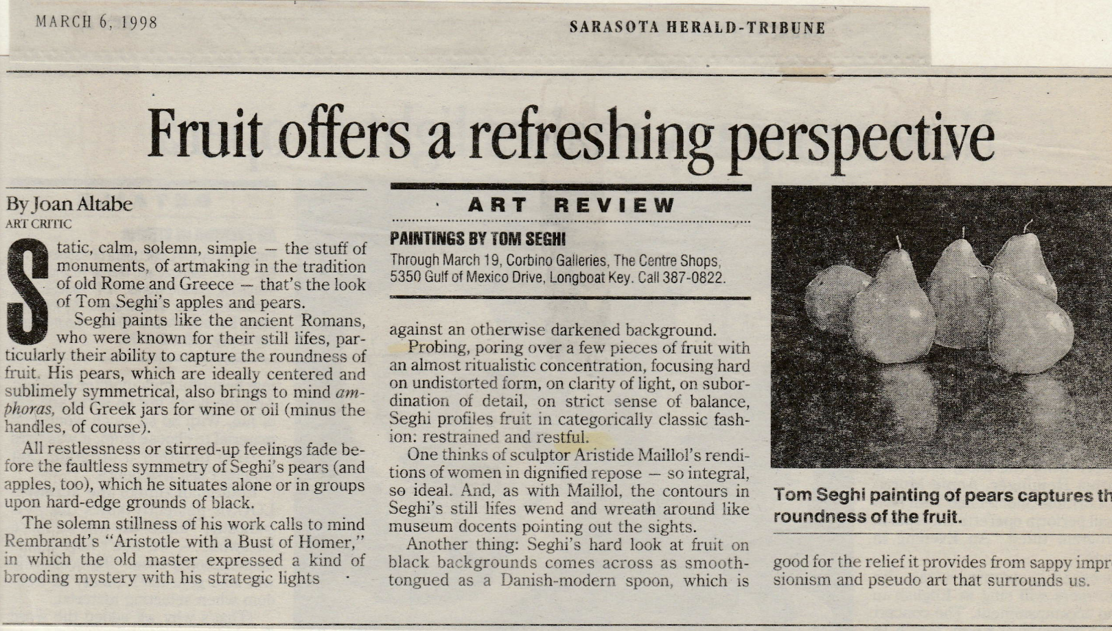 Sarasota Herald-Tribune. “Cool and classical Tom Seghi.” By Joan Altabe. Sarasota Herald-Tribune, 18 July 1998, Sarasota, FL